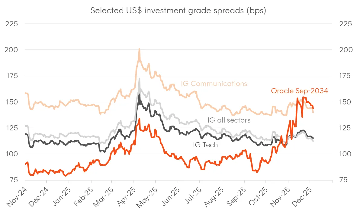 Recently, AI-related capex has become a major story for the US economy, but it’s also emerged as a focal point in credit markets. During November, concerns around debt-financed capex drove credit spreads wider and spilled over to stock prices, with activity in markets for credit protection surging for selected cloud names. Although spreads across the technology sector more generally have since retraced, some names like Oracle remain elevated, and the collision between Silicon Valley’s ambitions and the bond market’s demand for cash flows will likely define credit markets for years to come.