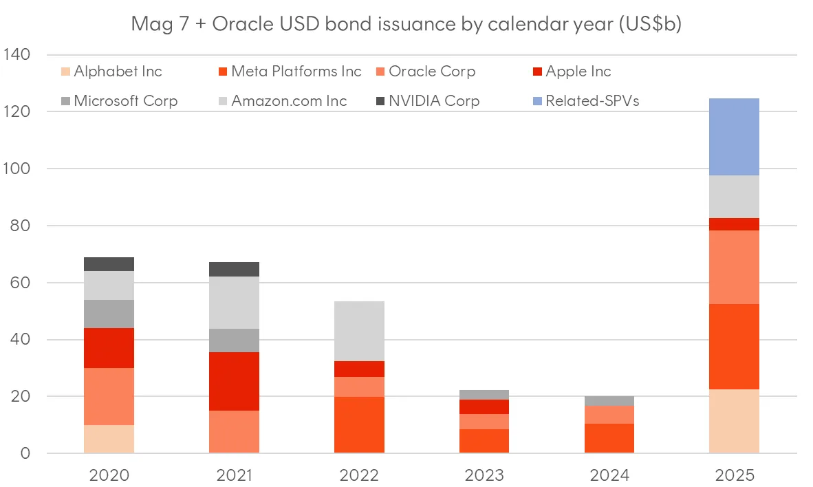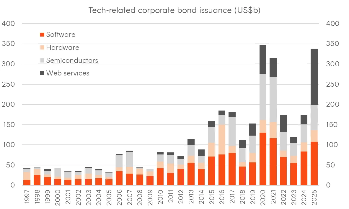 2025 has already seen a surge in technology-related bond issuance alongside activity in syndicated loan and private debt markets. Over US$300 billion in corporate bonds have been sold from the technology sector, with the Magnificent 7 and Oracle collectively issuing US$100 billion.