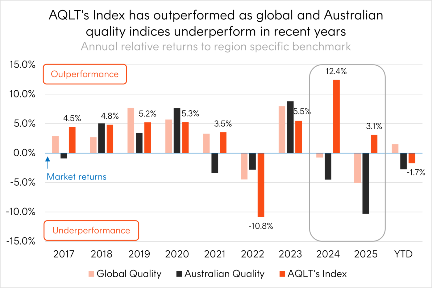 Source: Bloomberg. Annual returns from 2017 to 2025 and year to date returns from 31 Dec 2025 to 27 Feb 2026. AQLT’s index is the Solactive Australia Quality Select Index and benchmarked to the S&P/ASX 200. Global Quality represented by the MSCI World Quality Index and benchmarked to the MSCI World Index. Australian Quality represented by the MSCI Australia Quality Index and benchmarked to the S&P/ASX 200. You cannot invest directly in an index. Past performance is not an indicator of future performance.