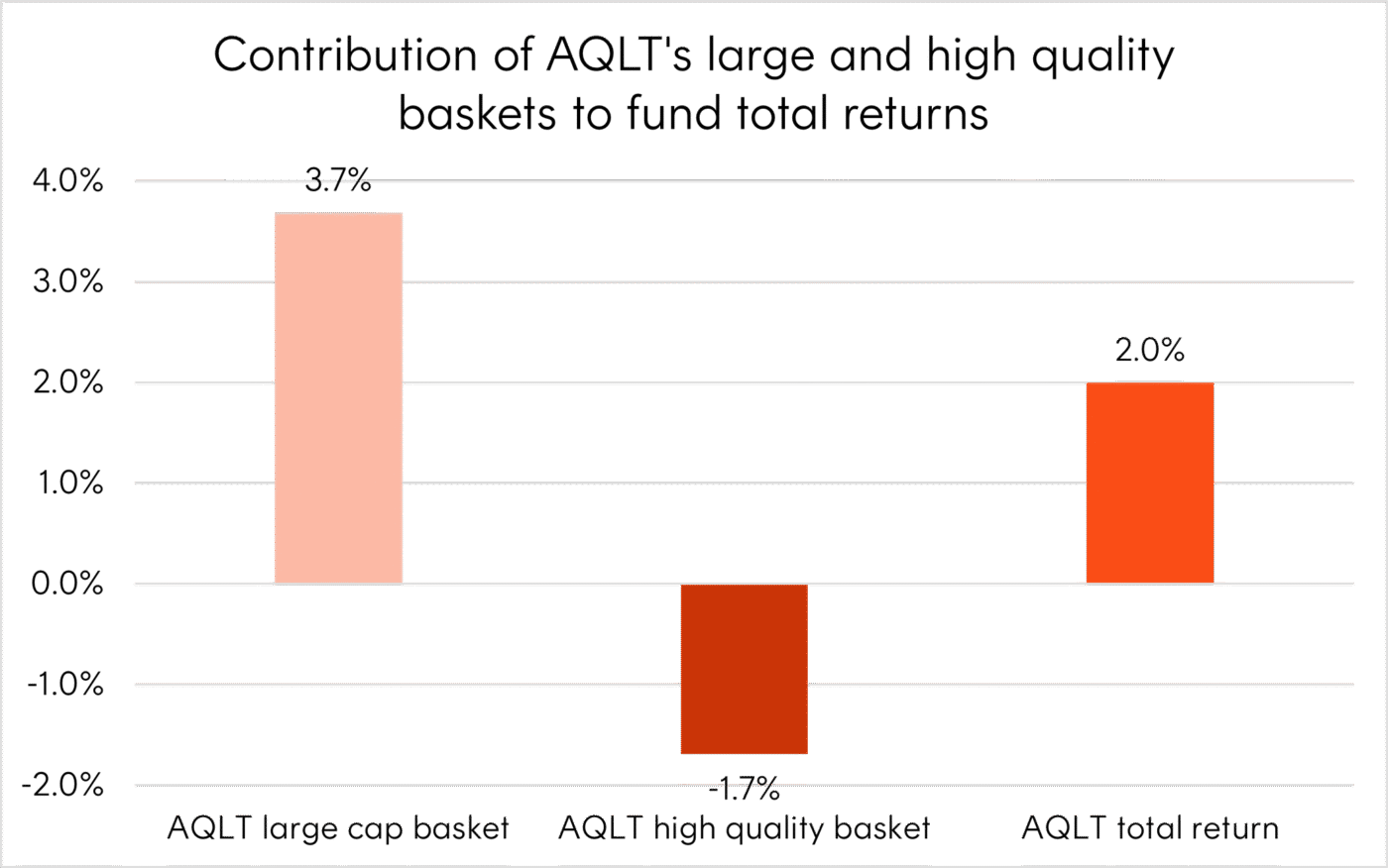 Year to date, as Australia’s large cap banks and materials companies have outperformed, AQLT’s large cap basket has more than offset the underperformance of AQLT’s high quality basket2. High quality companies in Australia suffered from a volatile corporate reporting season as earnings were scrutinised and valuations came into question – particularly for software-based technology companies.