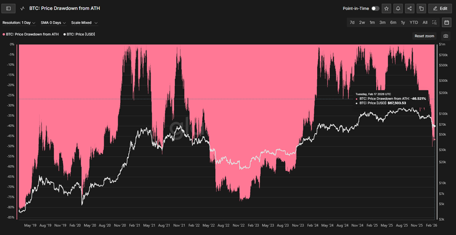 According to data from Glassnode, as of 14 February 2026, Bitcoin is down 44% from its last all time high. This may seem intense but relatively speaking, it is a much smaller decline than seen in previous cycles.