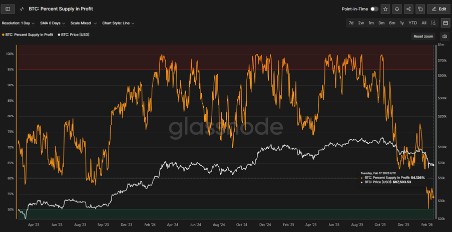 According to data from Glassnode, as of 14 February 2026, the percentage of circulating supply in profit has fallen to 56% at current prices.