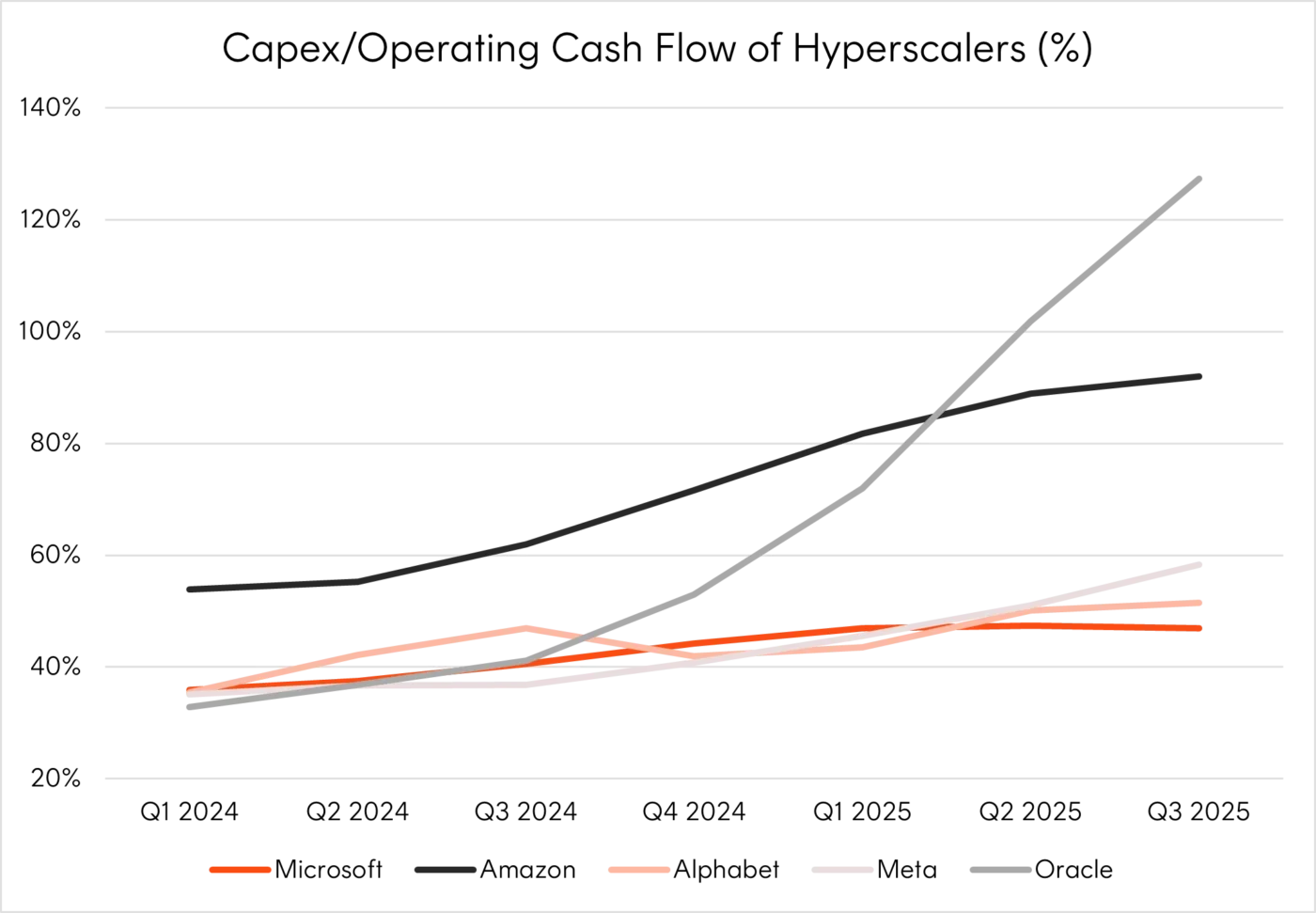 The “Magnificent 7” have earned their leadership through consistent profit growth, pricing power, and reinvestment into future initiatives. Collectively, they generated more than US$200 billion of free cash flow in the last year. While debt issuance has risen, most AI-related capex is funded by operating cash flows (Oracle being the key exception) which is underpinning much of their market leadership, rather than speculative capital.