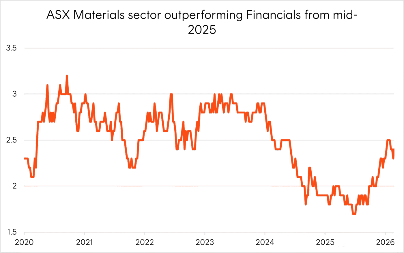 Source: Bloomberg. As at 23 February 2026. Series shows S&P/ASX 200 Materials sector divided by S&P/ASX 200 Financials sector from 1 January 2020 to 23 February 2026. Past performance is not an indicator of future performance. You cannot invest directly in an index.