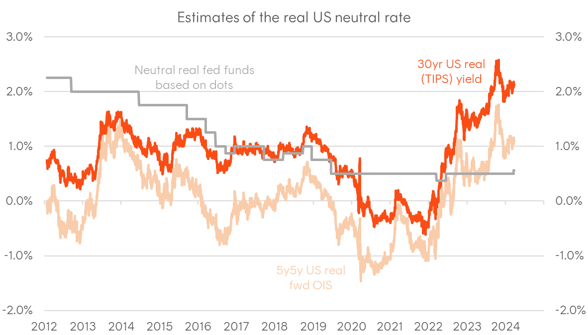 Although much of the attention and price action focused on Powell’s rhetoric regarding rate cuts (still on the cards to start in June) and the balance sheet (the pace of the run-off likely to slow), the upgrade of the FOMC’s long-run fed funds rate estimate (to 2.625% from 2.50% previously) may possibly be the most impactful. It’s the first clear admission from an official policy release that the Committee is entertaining the idea of a higher neutral rate than 2.5% in the post-covid environment. As I’ve said before, if we expect a soft landing, then it’s evidence that the US economy is structurally stronger today than in the pre-COVID years, necessitating a higher real neutral rate.