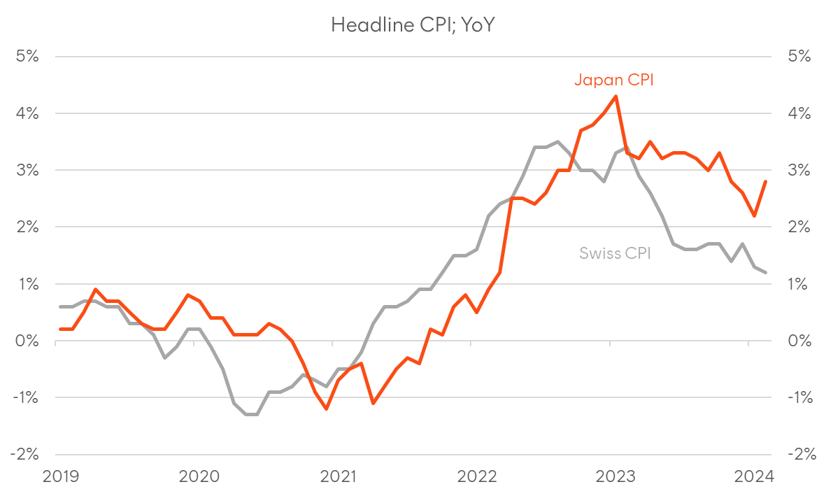 On the topic of the Bank of Japan’s (BoJ) first rate hike in 17 years last week (to +0.10% from -0.10% previously), I might start by contrasting it with Switzerland’s rate cut only two days later (to 1.5% from 1.75%), the first developed central bank to officially ease policy this cycle. Both Japan and Switzerland have been dealing with demographic challenges and deflationary pressures over the past 30 years, and both central banks were early adopters of negative interest rate policy (‘NIRP’). However, the post-COVID period has seen a pretty big divergence in both the relative stance of policy and their respective currencies, with the CHF/JPY around 60% higher from early 2020 levels, as the franc remained well supported on a combination of SNB hikes, the currency being a geopolitical haven, and experiencing relatively subdued inflation pressures, while the JPY was the funding currency de jure in a gigantic policy divergence trade and a crude oil importer against a backdrop of growing energy insecurity. The end of NIRP is highly symbolic, but is it really evidence of Japan finally leaving secular stagnation behind or just a counter-trend inflationary cycle driven by a more volatile global supply chain? Comparing inflation data across different regions in recent years points to Japan lagging European trends, which means further rate hikes from the BoJ might be limited.