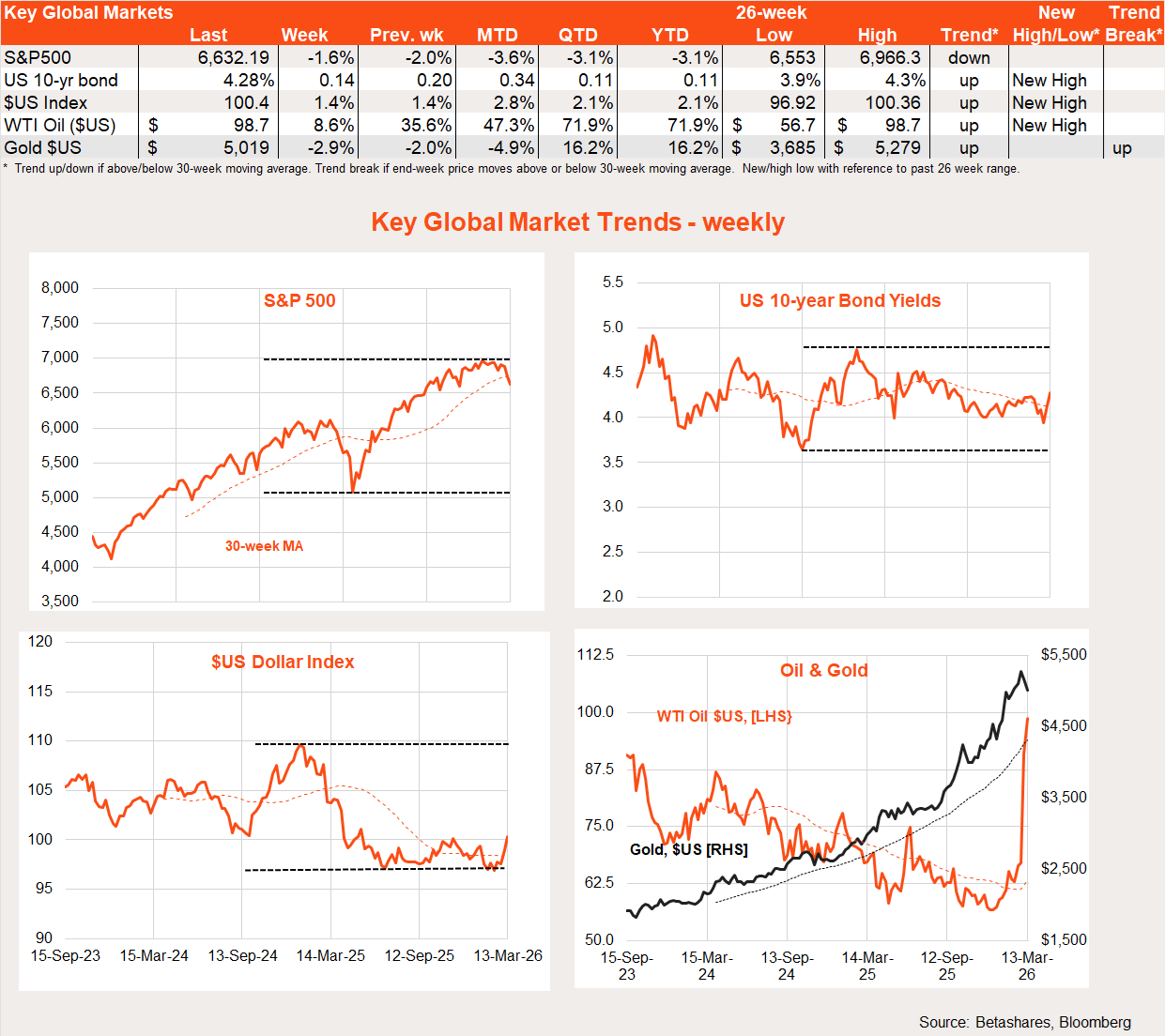 With equities down and bond yields up, pressure is seemingly mounting on US President Donald Trump to declare victory and walk away. Markets thought the TACO (‘Trump Always Chickens Out’) moment had come early last week when Trump declared the war was “very complete, pretty much”. But like the Iranians, he then spent the rest of the week digging in, with Iranian taunts on social media hardly helping if he was looking for a face-saving exit.
