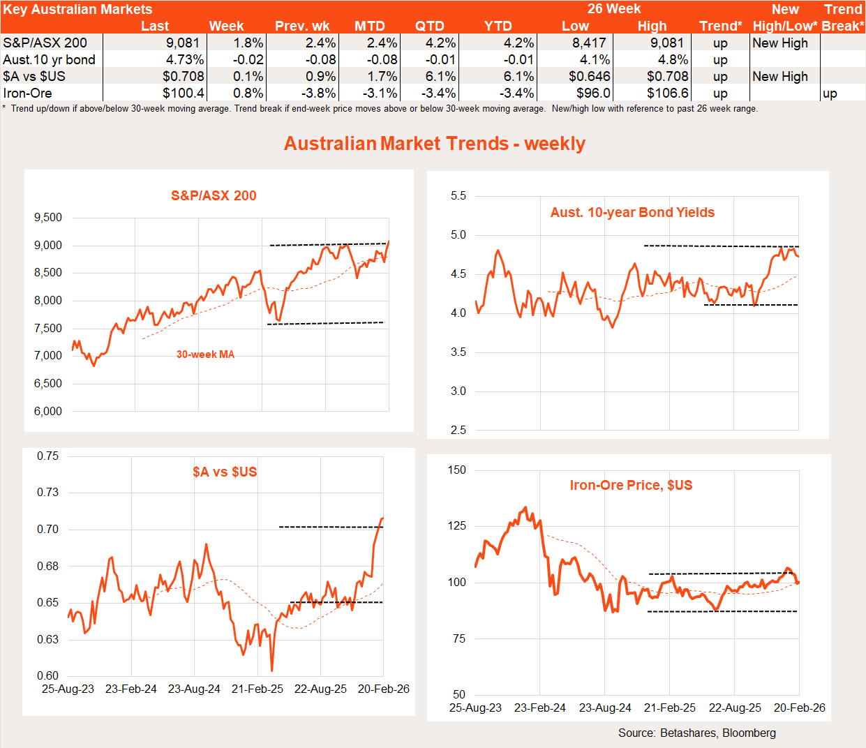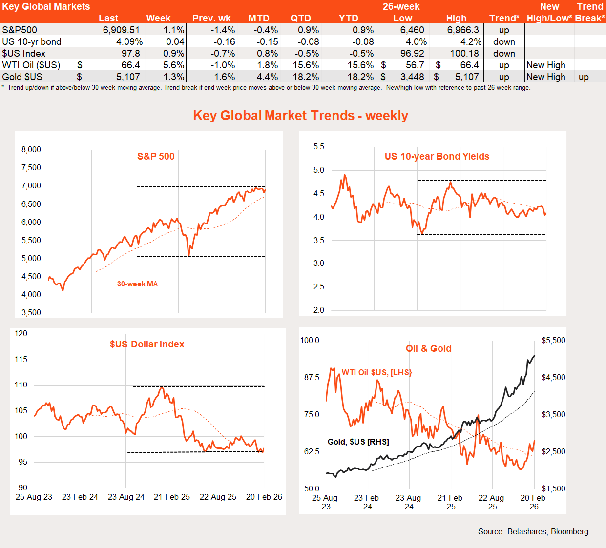 There was little in the way of major global economic news during the week, allowing equity markets scope to stage a modest recovery after the previous week’s decline. Although AI disruption jitters remain, the impact on overall markets was relatively calm last week. That said, there was a late-week announcement from Anthropic on new cybersecurity tools which did sent a shudder through that part of the technology sector.