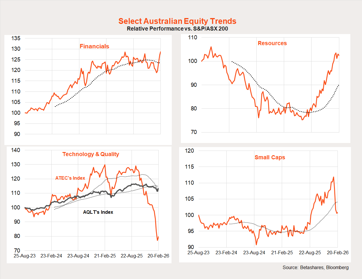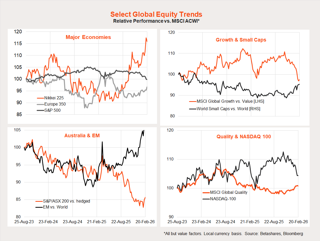 At this stage, however, the great rotation remains in place. Since the end of October 2025, we’ve seen underperformance of US/growth/technology, replaced by strength in Japan, emerging markets and small caps. There are also tentative signs of a bottoming out in the underperformance of the Australian market.