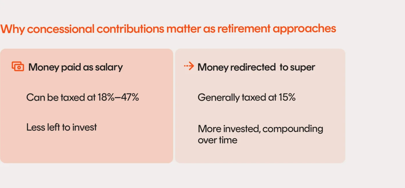 It means money redirected from salary into super is often taxed at a lower rate than your income and stays invested for the years ahead. Even a few years of maximising concessional contributions can impact the size – and sustainability – of retirement income.