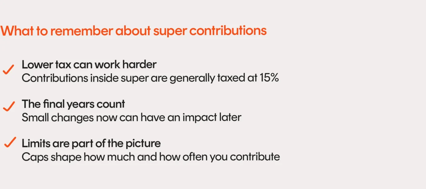 In the years before you stop working, super contributions can become one of the most effective levers you have – to reduce tax, boost your balance and shape the income you’ll eventually rely on.