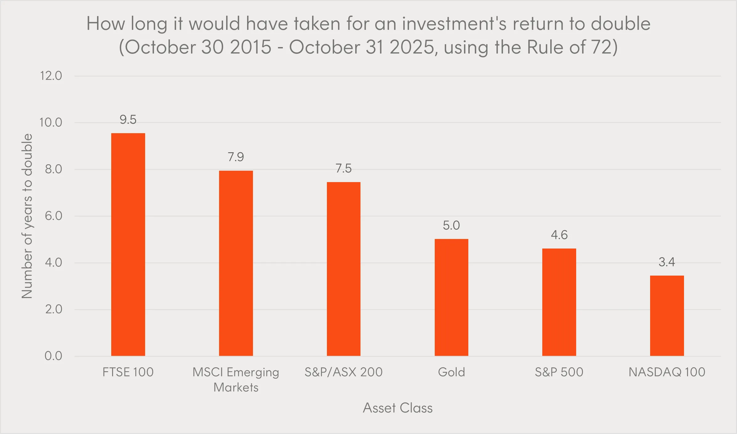For instance, if we used the S&P/ASX 200’s 10-year annualised return of 9.65% p.a., the starting capital would double every 7.5 years if future returns matched this historical rate. In contrast, if we used the NASDAQ 100’s 10-year annualised return of 20.89% p.a., the starting capital would take 3.4 years to double under the same assumption. Note all of these figures are as at 31 October 2025 and that these are hypothetical examples only – future returns may differ significantly from historical performance.