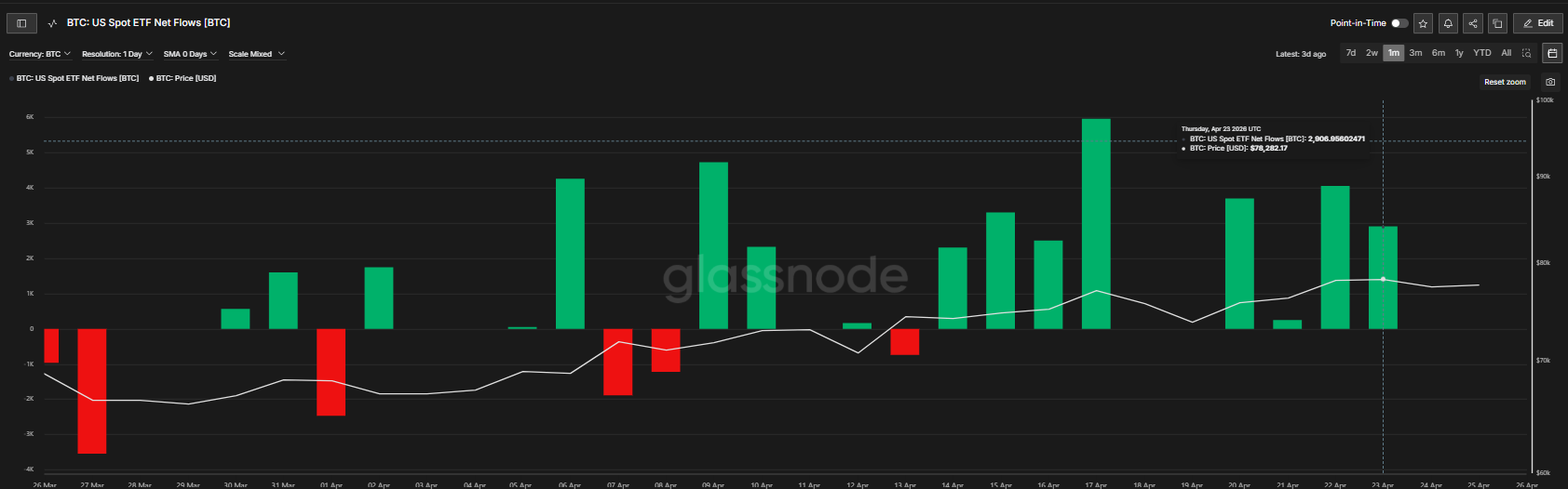 According to data from Glassnode as of 26 April 2026, ETF net flows in April suggested continued demand through institutional-grade channels rather than speculative excess, with persistent inflows reinforcing the view that traditional capital continues to absorb supply even as Bitcoin pushes higher.