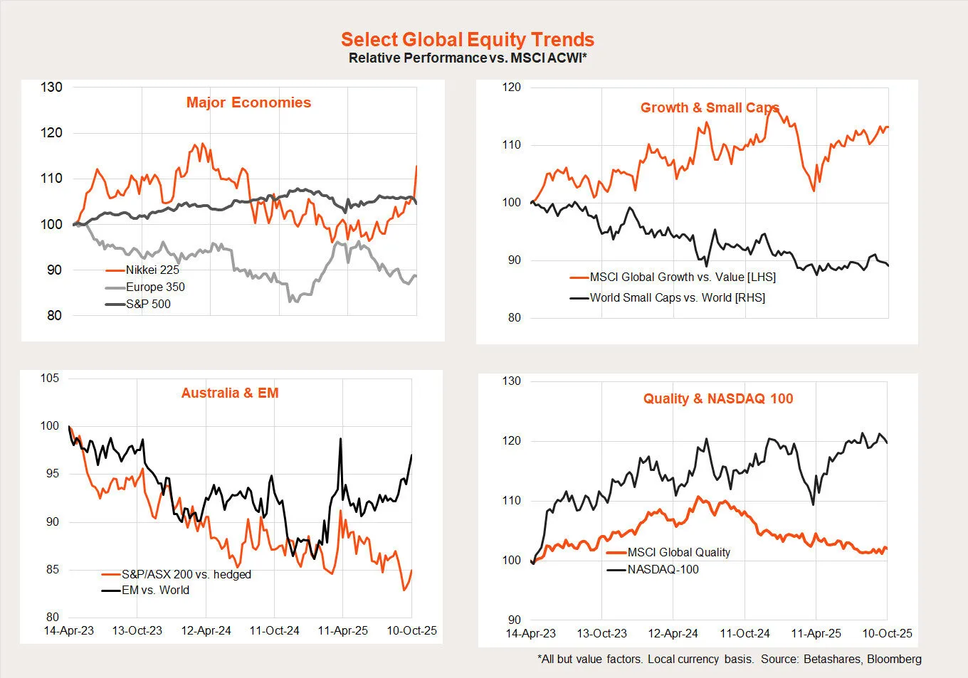 The relative performance of long popular themes – US/NASDAQ-100/growth – has rolled over somewhat and been replaced with strength in emerging markets and Japan in particular. Australia and Europe are still underperforming, however, while quality and small caps are at least no longer underperforming.