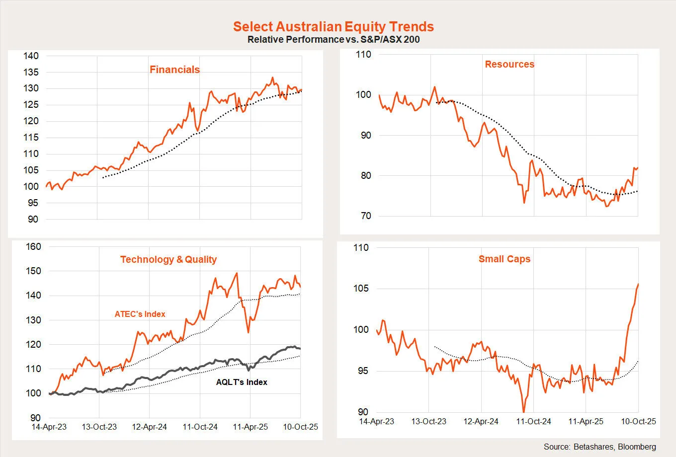As has been the case globally, there’s also notable shifts taking place in the Australian equity market. As evident in the chart below, there’s a rotation from financials to resources taking place among large caps, and a notable rotation from large caps in general into small caps.