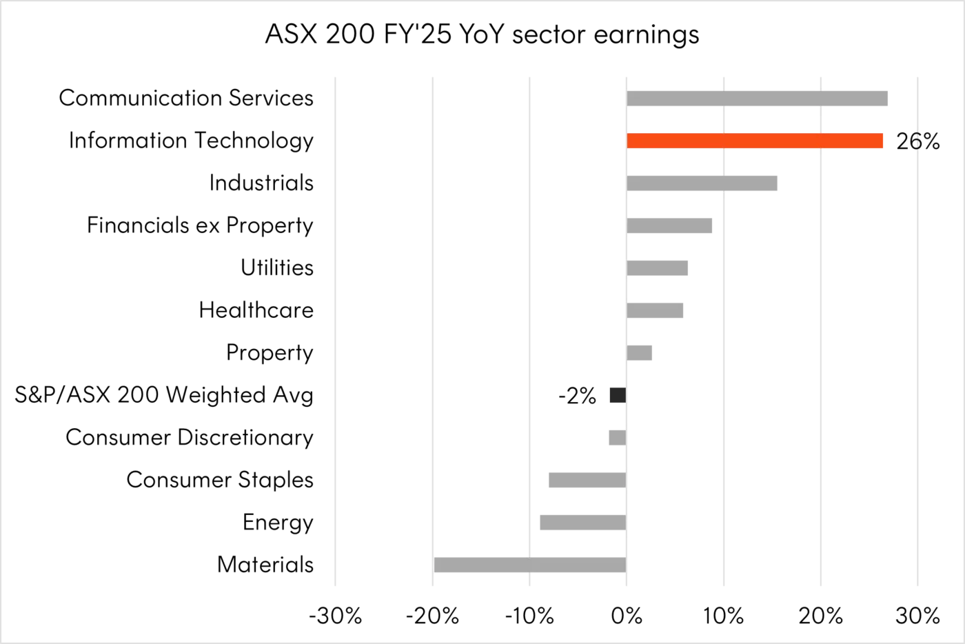 However, this underwhelming headline for the ASX 200 masks strong pockets of growth under the surface of the Australian equity market. For instance, the Australian Information Technology (IT) sector has achieved a higher rate of earnings growth than its S&P 500 counterpart over this same two-year period2. In FY25, the Australian IT sector grew earnings by a commendable 26.4%, trailing only the complementary Communication Services sector.