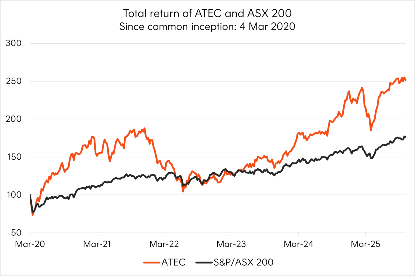 Source: Bloomberg. 4 March 2020 to 14 October 2025. ATEC represents the live performance of Betashares S&P/ASX Australian Technology ETF. You cannot invest directly in an index. Past performance is not an indicator of future performance.