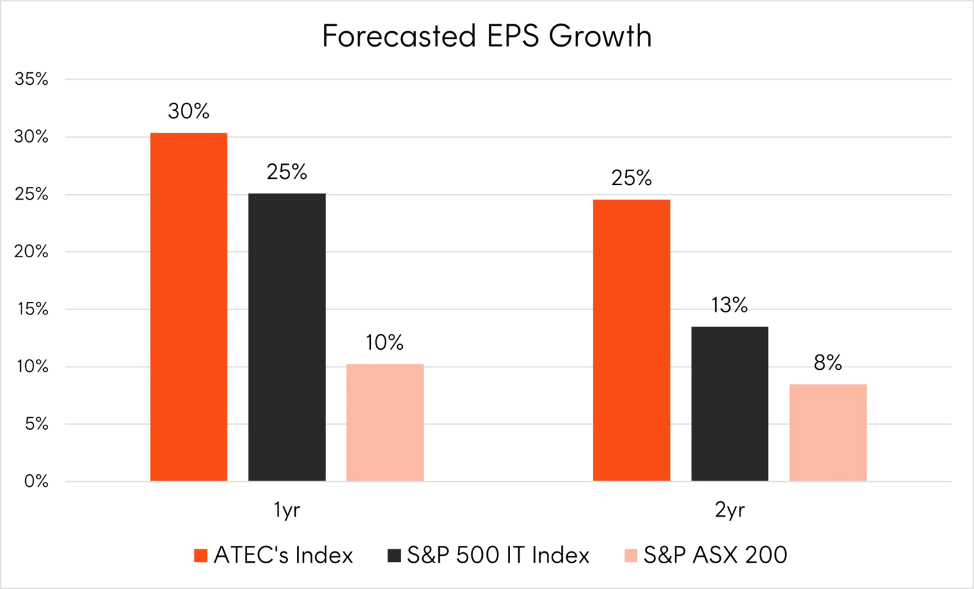 Over the next two years, the companies in the S&P/ASX All Technology Index are expected to grow earnings above 25%, not only outpacing the ASX 200 by three times, but also at a higher rate than the US IT sector6.