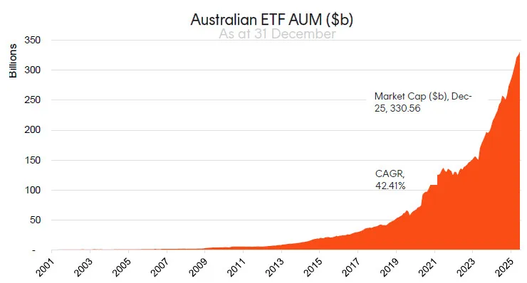 - FUM: The Australian ETF industry ended the year at an all time high, with the total industry market capitalisation sitting at $330.6B, representing 34.2% year on year growth. The industry grew $84.3B in 2025 – an industry record in terms of annual growth
