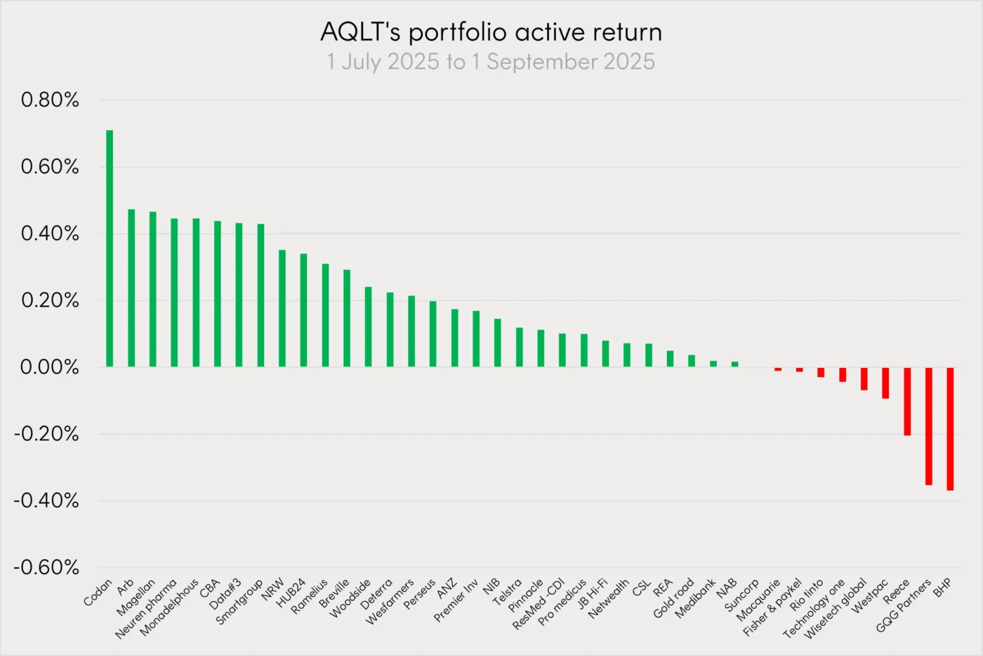 Source: Bloomberg, Betashares. Performance based on attribution data of Betashares Australian Quality ETF (AQLT) and ASX 200 Index from 1 July 2025 to 1 September 2025 and includes stocks held within AQLT during the period. There is no guarantee these stocks will remain in AQLT’s portfolio or be profitable investments. Past performance is not an indicator of future performance.