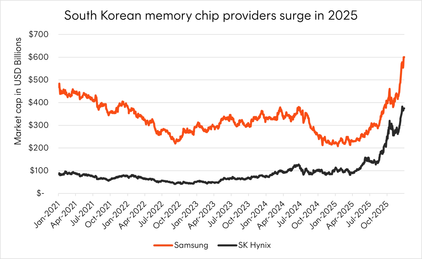 Samsung and SK Hynix are both leaders in memory chips – a critical component that sits within a graphics processing unit (GPU) to ensure huge amounts of data can be processed in a seamless manner. It is both the necessity of these chips and the relatively concentrated network of suppliers that have driven remarkable moves in memory prices, by some 40-50% in the final quarter of 20252.