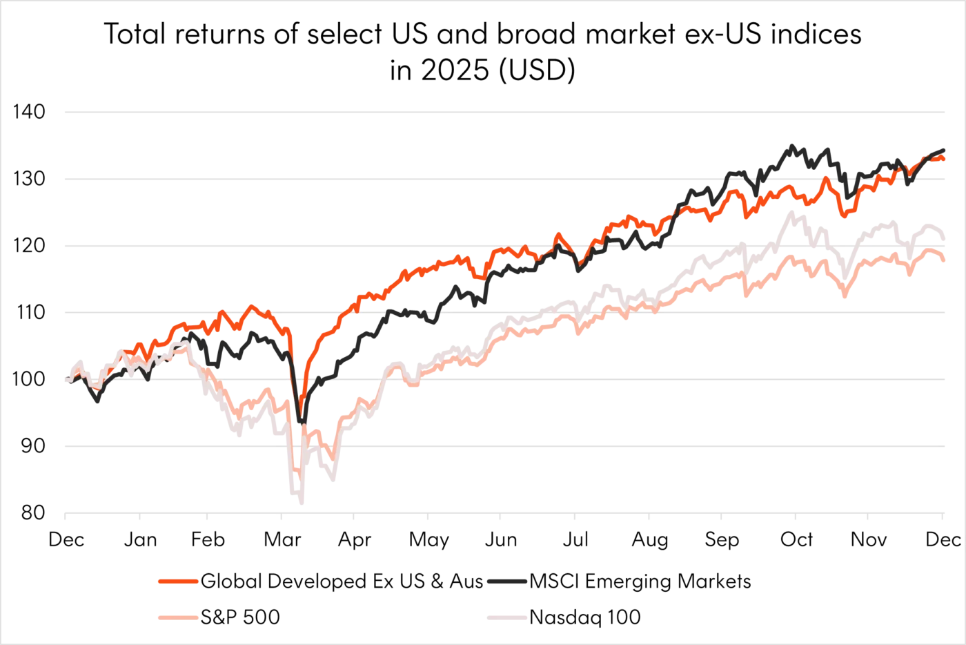 Source: Bloomberg. 31 December 2024 to 31 December 2025. Returns in USD. Global Developed Ex US & Aus represented by the Solactive GBS Developed Markets ex US ex Australia Large & Mid Cap AUD Index NTR. You cannot invest directly in an index. Past performance is not an indicator of future performance.