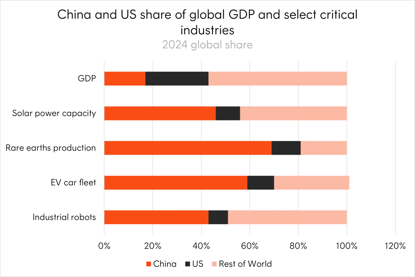 While the US currently dominates chip design and has historically restricted China through export controls, China increasingly controls the inputs and physical infrastructure of technological transformation. China’s resilience in recent trade tensions with the US highlights its strategic advantages, particularly in critical mineral mining and processing, whilst its dominance in batteries, renewable energy, and electric mobility creates alternative paths to tech leadership.