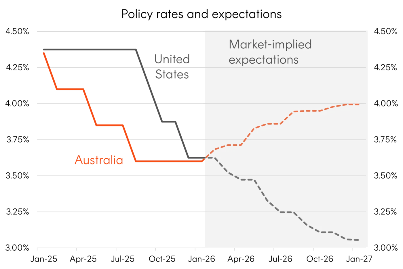 Heading into 2026, one of the most important market divergences to watch may be the expected policy rates for the US versus the rest of the developed world. Current pricing is for two further rate cuts in the US whilst other developed central banks are expected to hold or increase rates. For instance, while the RBA cash rate and Fed funds rate currently sit within the same band, markets expect the RBA cash rate to be 1% higher than the Fed funds rate by December 2026.