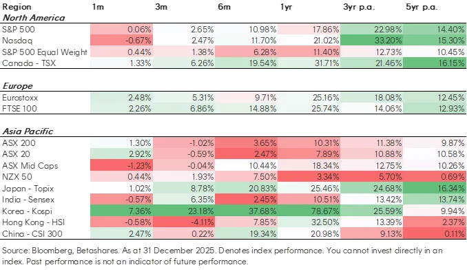 6. Source: Bloomberg. 31 December 2024 to 31 December 2025. Returns in USD. Global Developed Ex US & Aus represented by the Solactive GBS Developed Markets ex US ex Australia Large & Mid Cap AUD Index NTR. You cannot invest directly in an index. Past performance is not an indicator of future performance. ↑