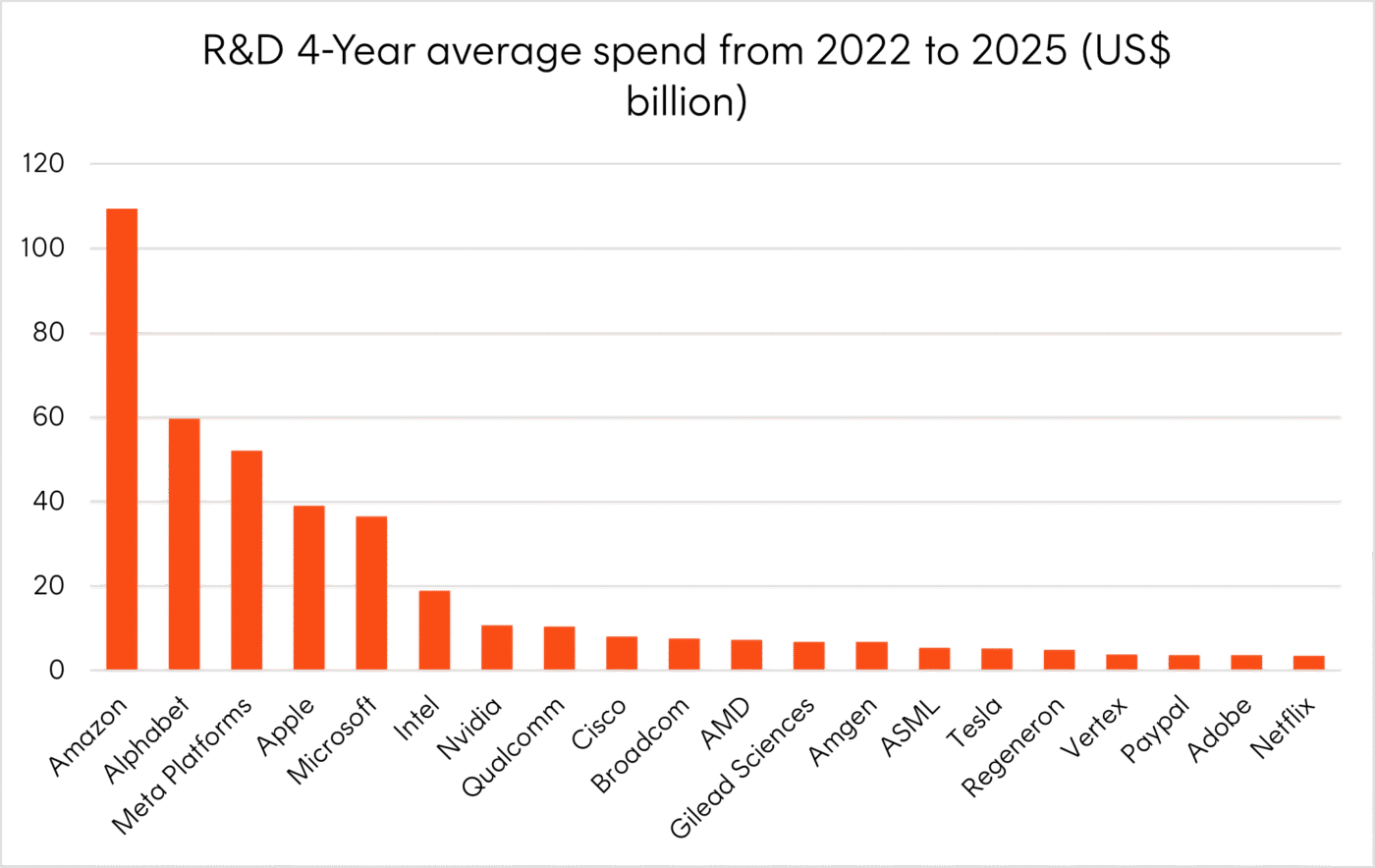 Finally, Trump’s One Big, Beautiful Bill Act (OBBBA) includes an incentive to encourage companies to spend more on R&D. This incentive allows companies to immediately expense domestic research and development (R&D) costs, in turn reducing both taxable income and tax payments. It is expected to provide a marginal boost to free cash flows for companies investing heavily in innovation, benefiting technology companies such as Amazon, Alphabet, and Meta.