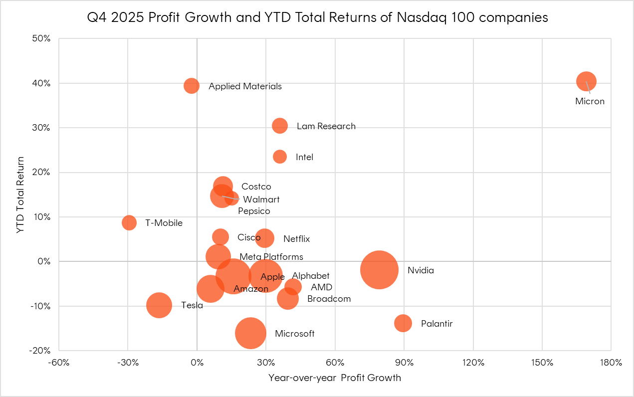 That evolution is taking place yet again as investors discern who will be the winners and losers of AI. Share price dispersion has widened significantly among the Magnificent 7 since Q4 2025, while earnings growth is broadening out to the other 93 companies within the index.