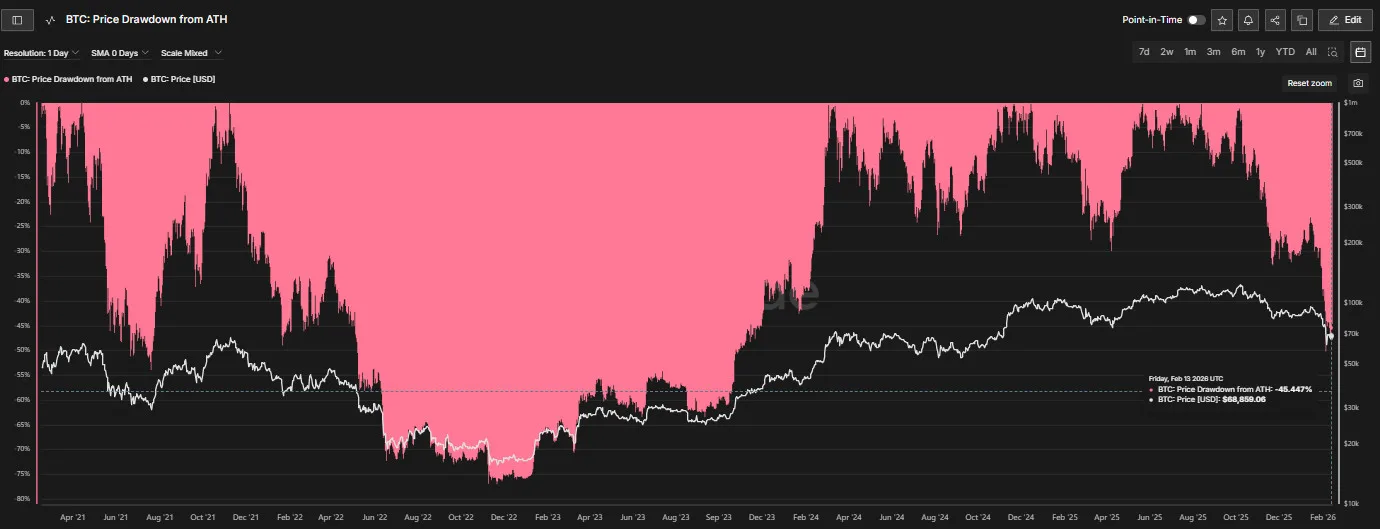 According to data from Glassnode, as of 14 February 2026, Bitcoin is down 44% from its last all time high. This may seem intense but relatively speaking, it is a much smaller decline than seen in previous cycles.