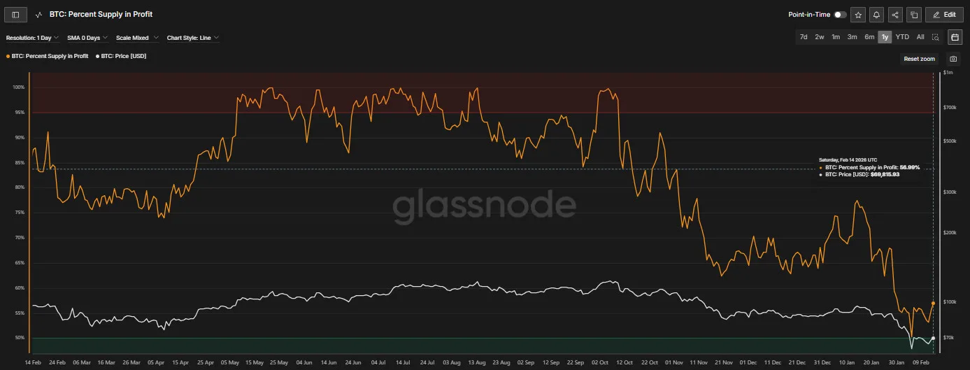 According to data from Glassnode, as of 14 February 2026, the percentage of circulating supply in profit has fallen to 56% at current prices.