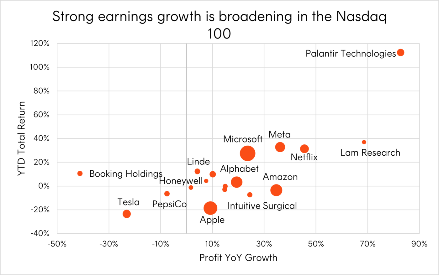 Chart 1: Q2 2025 profit growth and YTD return of select Nasdaq 100 companies