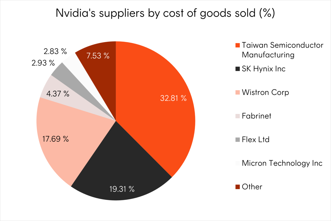 Examples include Taiwan Semiconductor Manufacturing and SK Hynix which both play a crucial role in GPU production. Together, these companies capture more than half of Nvidia’s cost of goods sold.