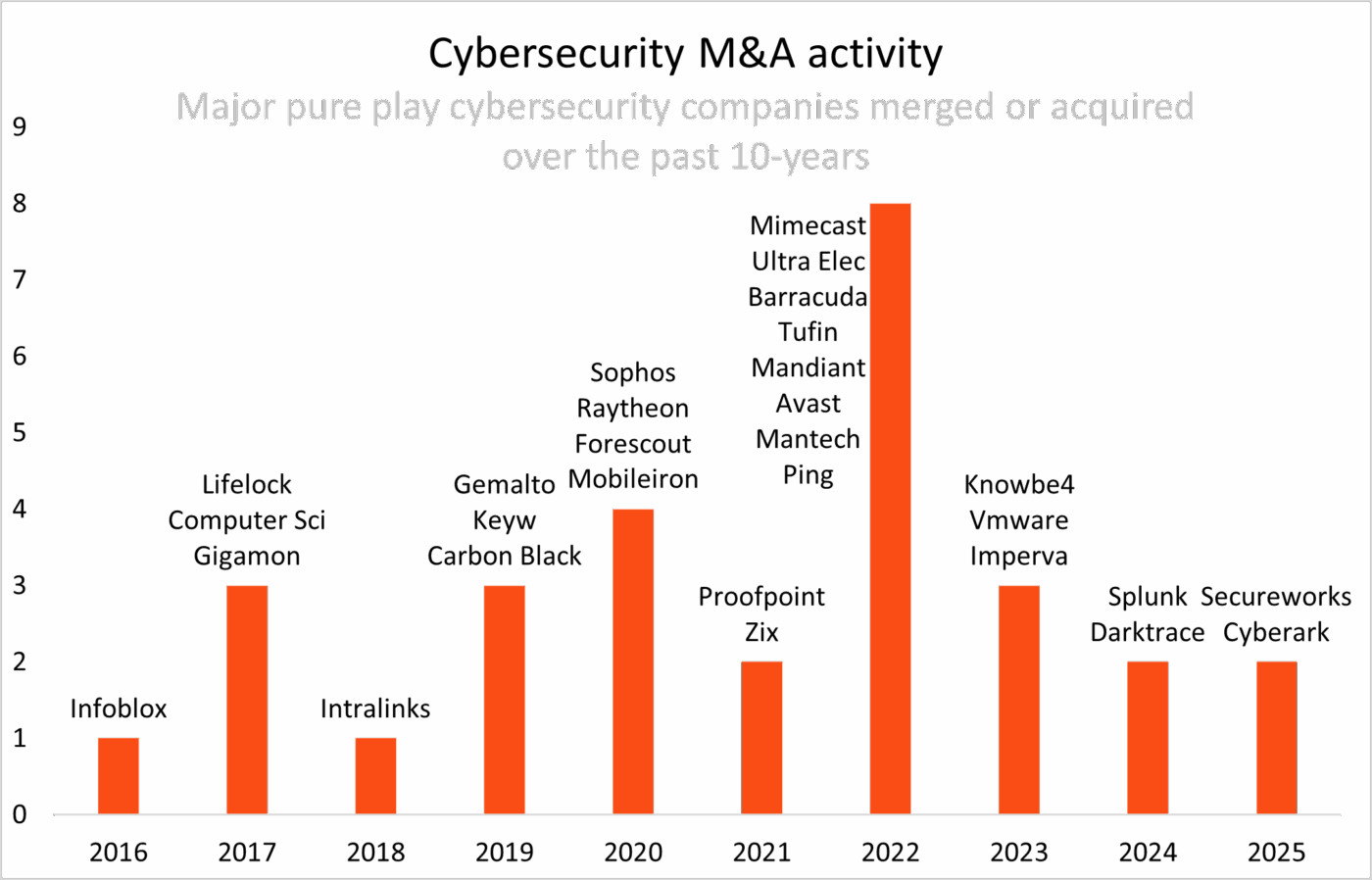 Source: Bloomberg and Tradar. As at 27 June 2025. Merger and acquisitions of companies in the Nasdaq Consumer Technology Association Cybersecurity Index.