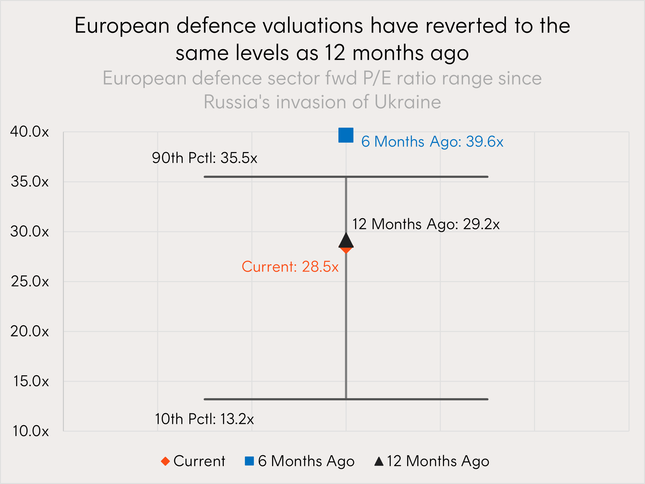 At the same time, the long-term outlook for European defence spending continues to strengthen. Europe has historically relied on the US for its security, but growing uncertainty around how much support the US will provide, particularly during periods of global conflict, is pushing European governments to increase defence spending targets so they can protect themselves independently. Despite this, European defence company share prices have fallen significantly in recent months, resetting to levels seen roughly a year ago[iv].