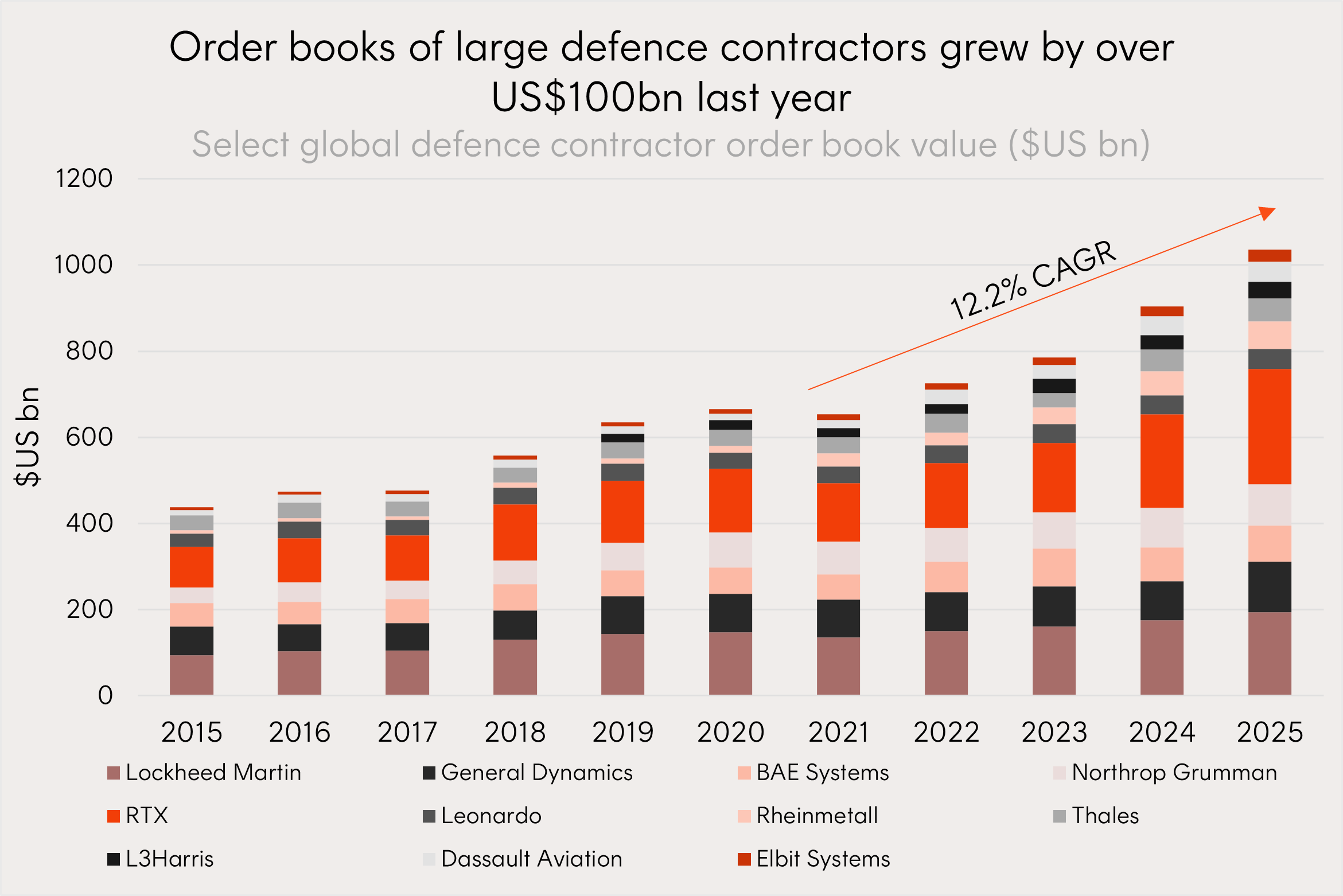 Source: Bloomberg, Betashares. Backlog order book value of select global defence contractors 2015 to 2025.