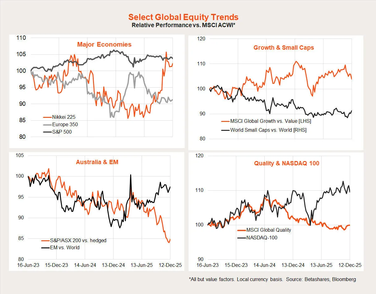 AI jitters saw the NASDAQ-100 drop a chunky 1.9% last week, with emerging markets, Japan and even Australian shares faring better. That said, it’s still premature to suggest the outperforming bias of US/growth/technology is shifting in favour of non-US and value.