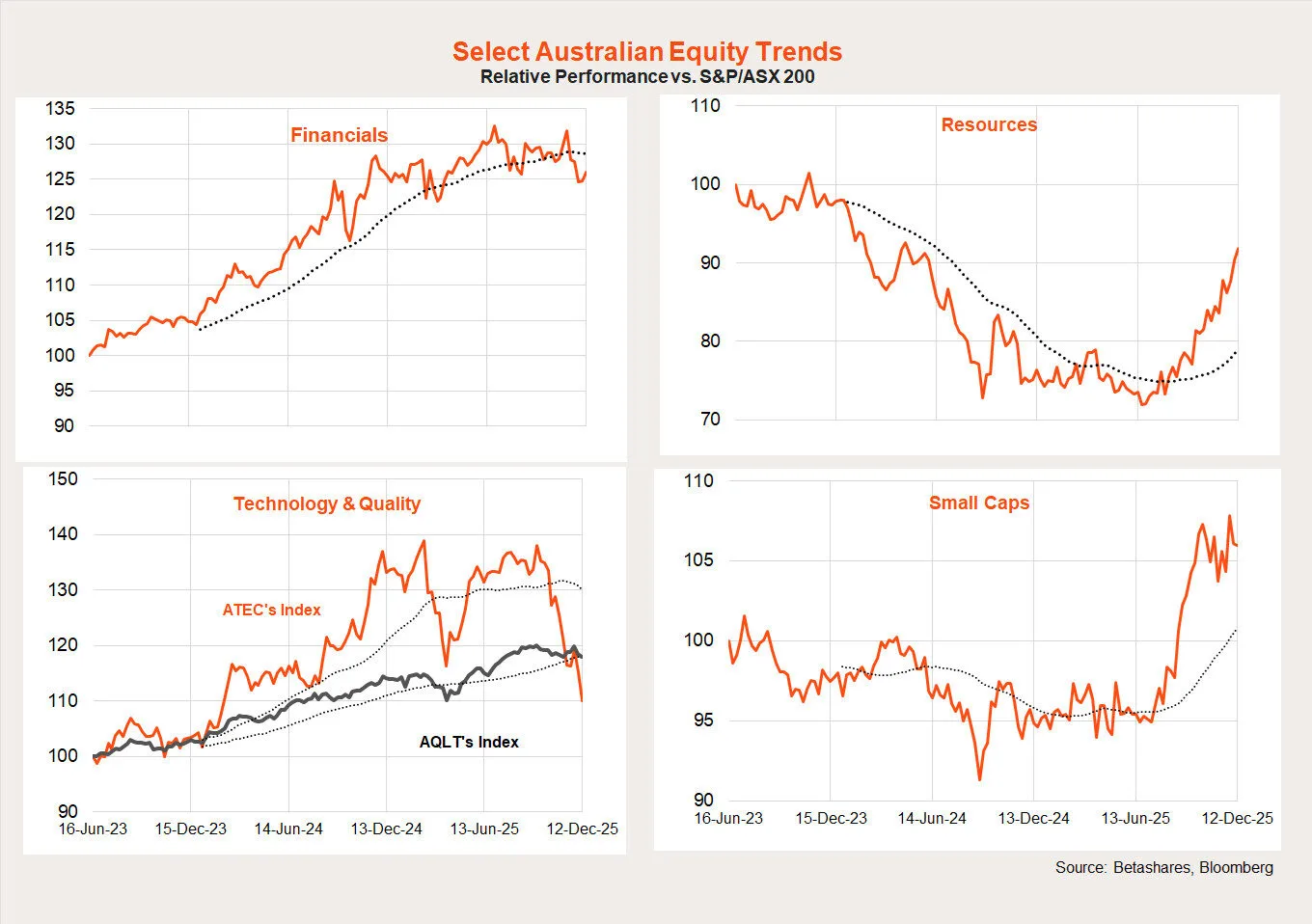 All up, resources are now clearly in the ascendancy while quality stocks are also holding up reasonably well.