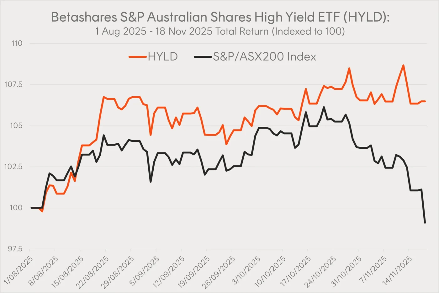 It is important to note that HYLD’s live performance is over a short time horizon (~4 months), and investors should not expect the current live performance differential versus the ASX200 to be representative of longer-term outcomes. HYLD’s index (the S&P/ASX 200 High Yield Select Index) has outperformed the ASX200 by 1.2% p.a. since its inception (31 July 2011 to 31 October 2025) before fees and costs (HYLD’s management fee is 0.25% p.a.).3