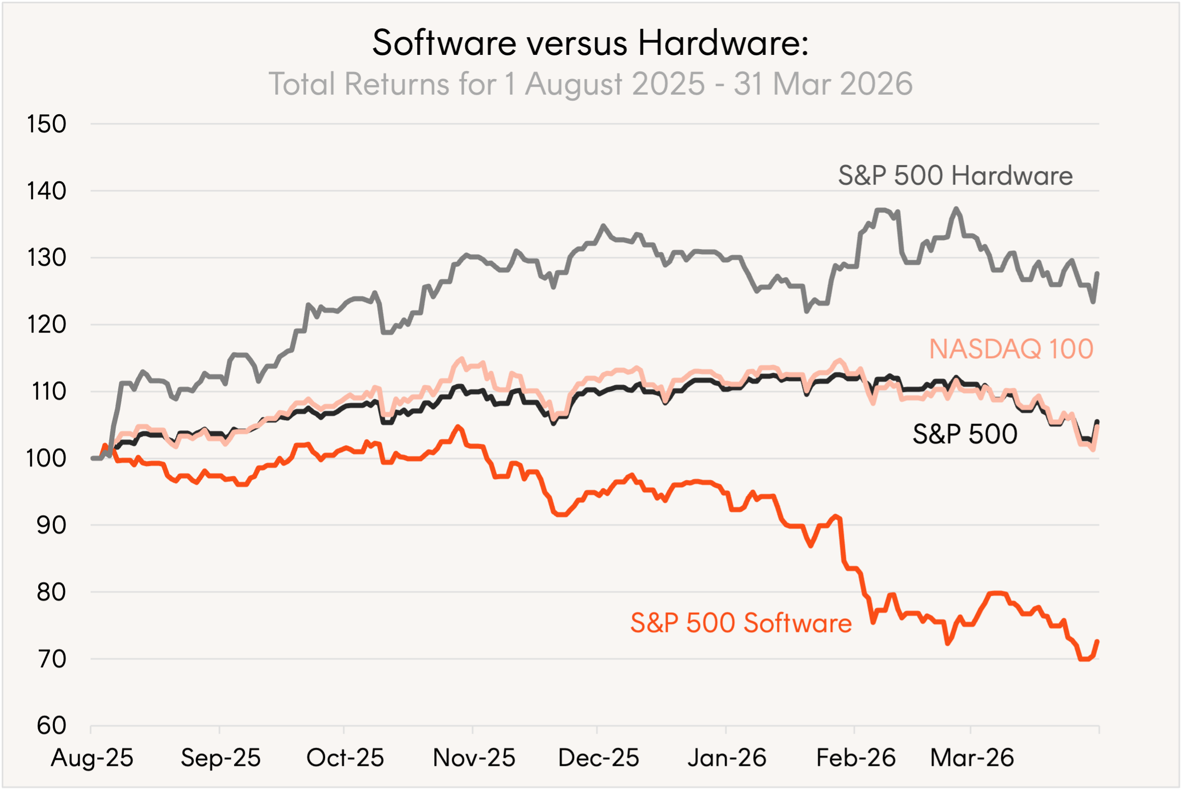 Source: Bloomberg, 1 August 2025 to 31 March 2026. S&P 500 Software and S&P 500 Hardware are industry sub-groups within the S&P 500. You cannot invest in an index. Past performance is not an indicator of future performance. Short-term performance can be volatile and is not a reliable guide to future returns.
