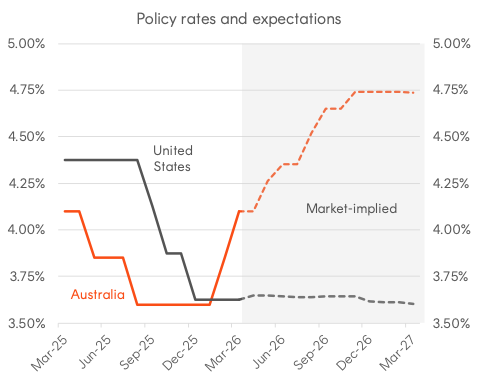 The quarter began with markets expecting the Reserve Bank of Australia to hold rates steady through the first quarter of 2026. It ended with two hikes delivered, most of the interest rate cuts from 2025 reversed, and all four major banks (as well as Betashares’ Chief Economist, David Bassanese) forecasting a third move in May5.