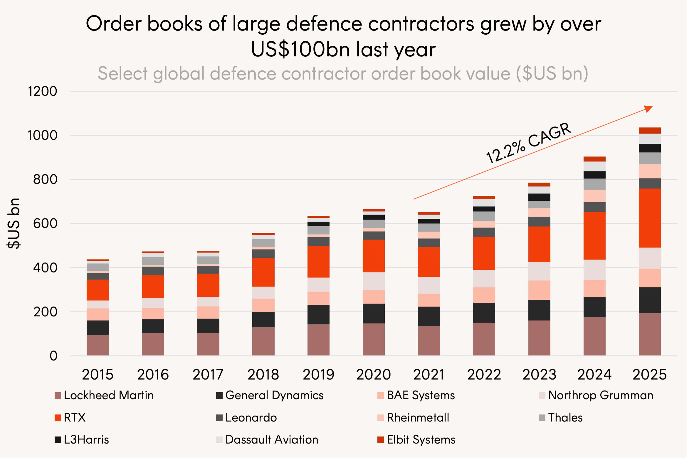 Source: Bloomberg, Betashares. Backlog order book value of select global defence contractors 2015 to 2025.