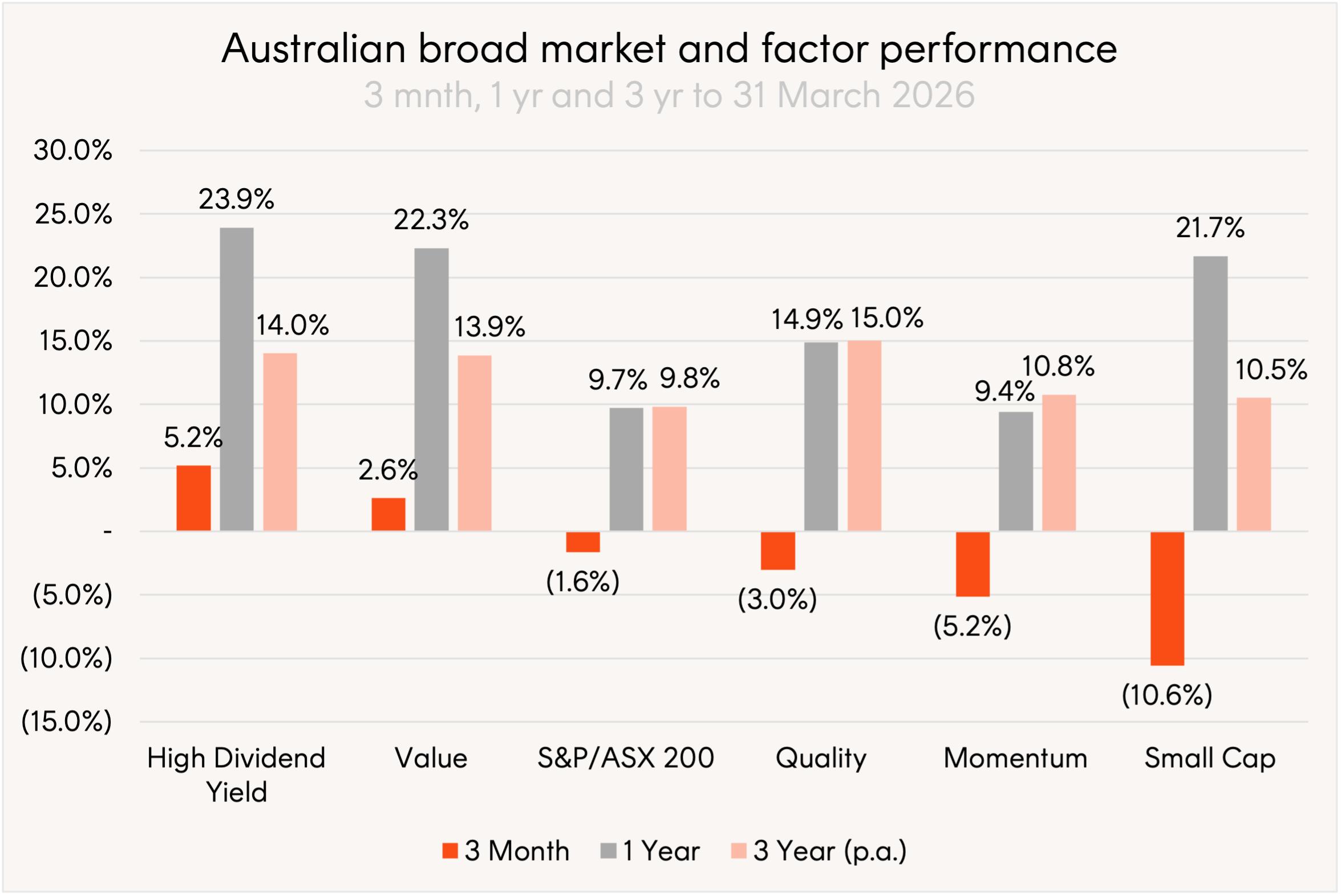 Source: Bloomberg, Betashares. 31 March 2023 to 31 March 2026. Quality: Solactive Australia Quality Select (SOLAUQST); High Dividend Yield: S&P/ASX 200 High Yield Select Index (SPATHYAT); Value: FTSE RAFI Australia 200 (TFRAU200); Momentum: Solactive Australia Momentum (SOLAUMST); Small Cap: Nasdaq Australia Small Cap Select (AUSCSGL); S&P/ASX 200: S&P/ASX 200 Total Return Index (ASA51). Past performance is not an indicator of future performance. You cannot invest directly in an index.