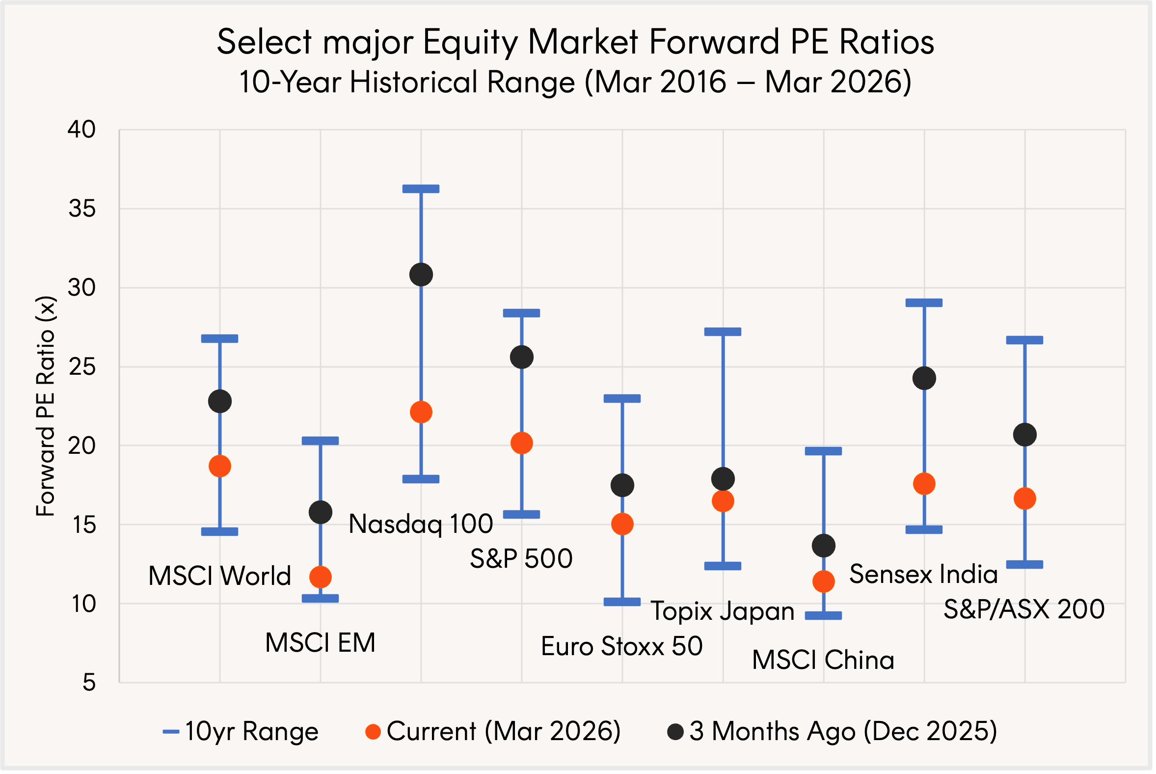 Whatever the resumption looks like, several major markets are now trading on price-to-earnings ratios and similar valuation measures materially lower than three months prior, with some approaching their most attractive levels in a decade. The MSCI EM, Nasdaq 100, and India’s Sensex stand out.