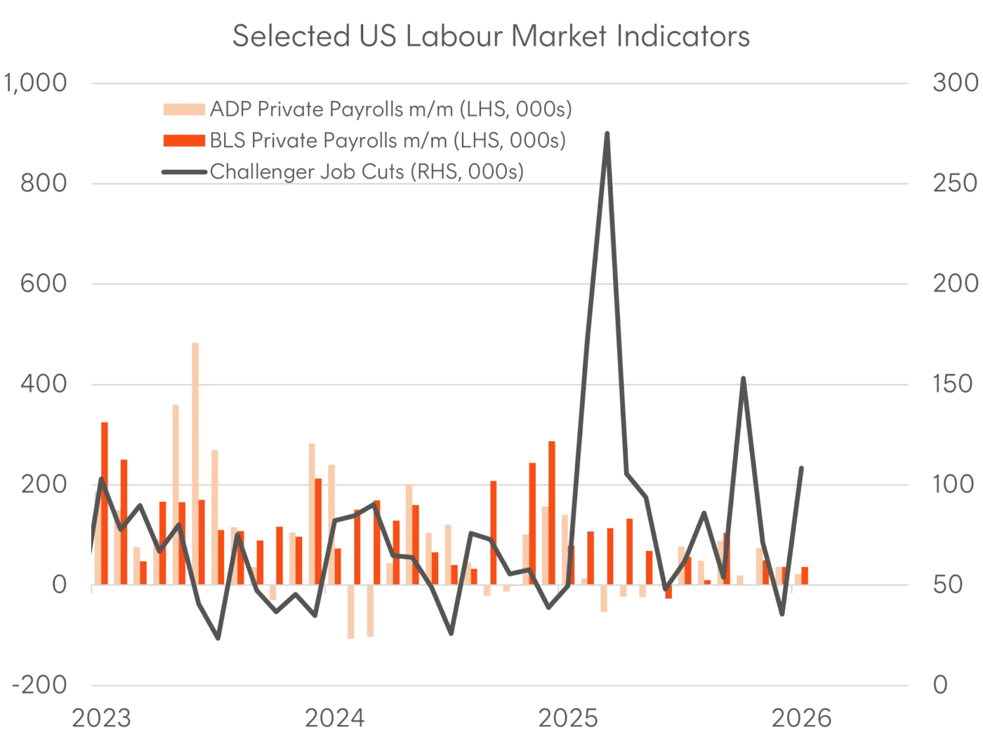 Sources: BLS, ADP, Challenger, Gray & Christmas.