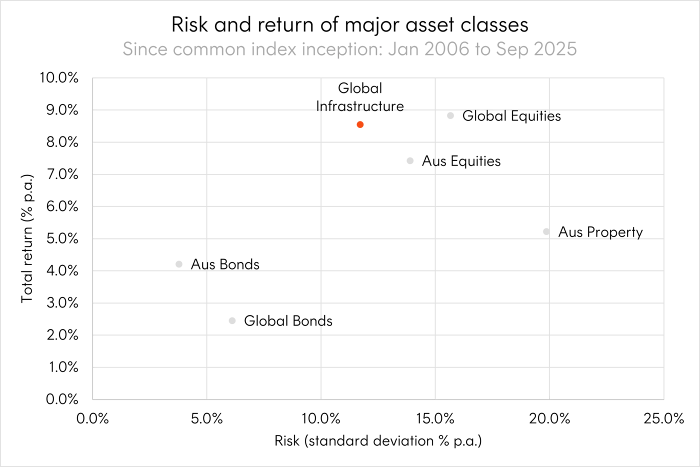 Source: Bloomberg. Past performance is not an indicator of future performance of any index or ETF. January 2006 to September 2025 using monthly data. Indices used: Global Infrastructure refers to the FTSE Developed Core Infrastructure 50/50 Hedged to AUD. Global Equities refers to the MSCI World Index. Aus Equities refers to the S&P/ASX 200. Aus Property refers to the S&P/ASX 300 A-REIT Index. Aus Bonds referrers to the Bloomberg Ausbond Composite 0+ yr Index. Global Bonds refers to the Bloomberg GlobalAgg Index. Indices do not take into account any ETF fees and costs. You cannot invest directly in an index.