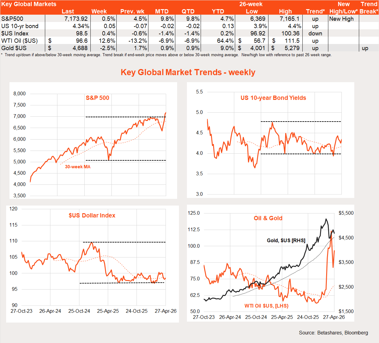 Also helping support equity markets are early signs of another bumper US earnings reporting season. According to FactSet, 84% of the 28% of S&P 500 companies that have reported Q1’26 earnings so far have beaten market estimates, which is above the long-run average of around 75%.