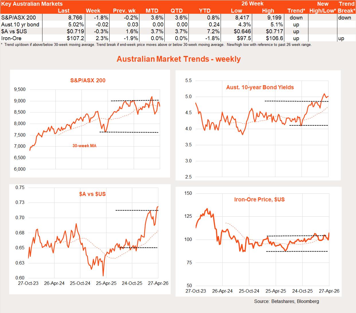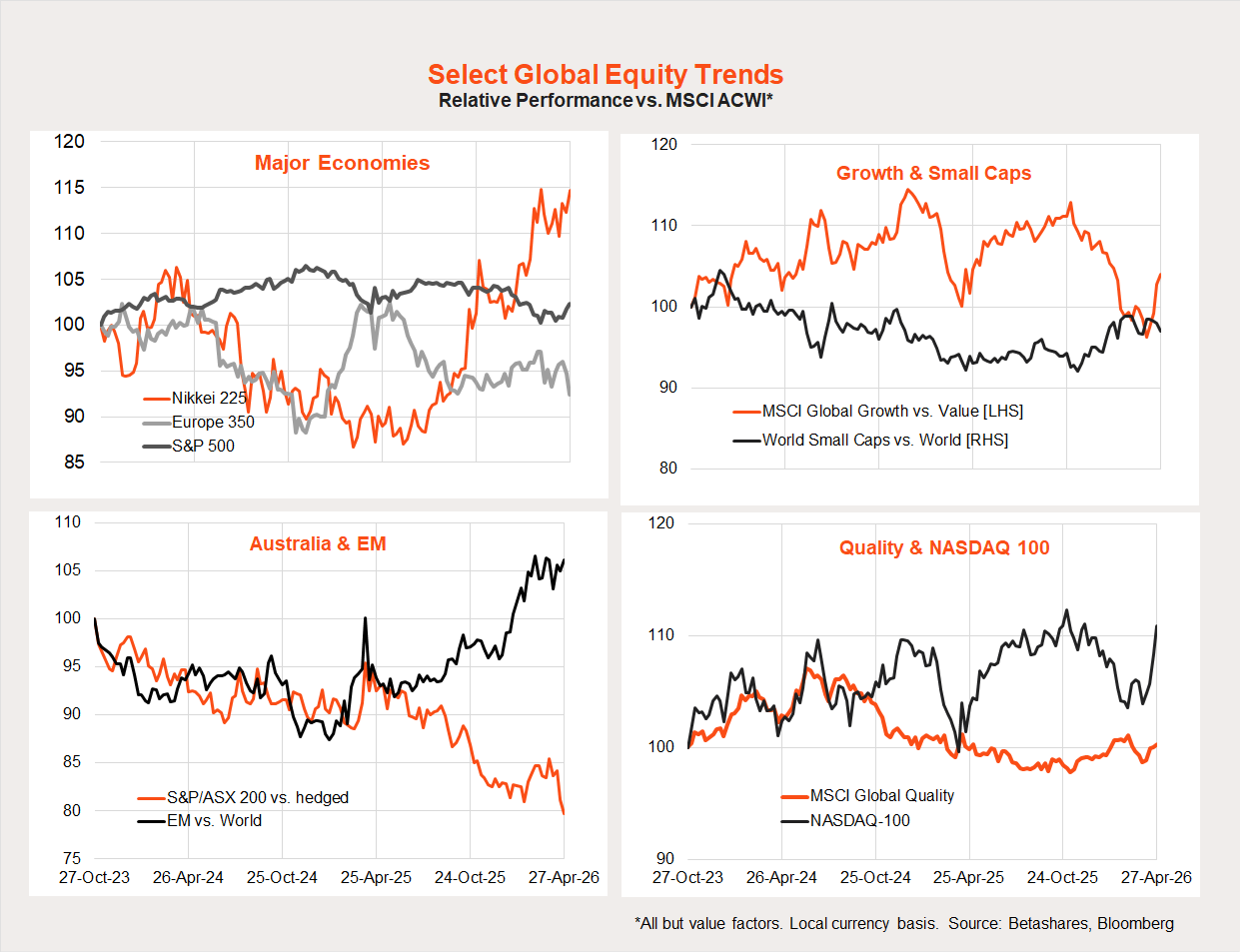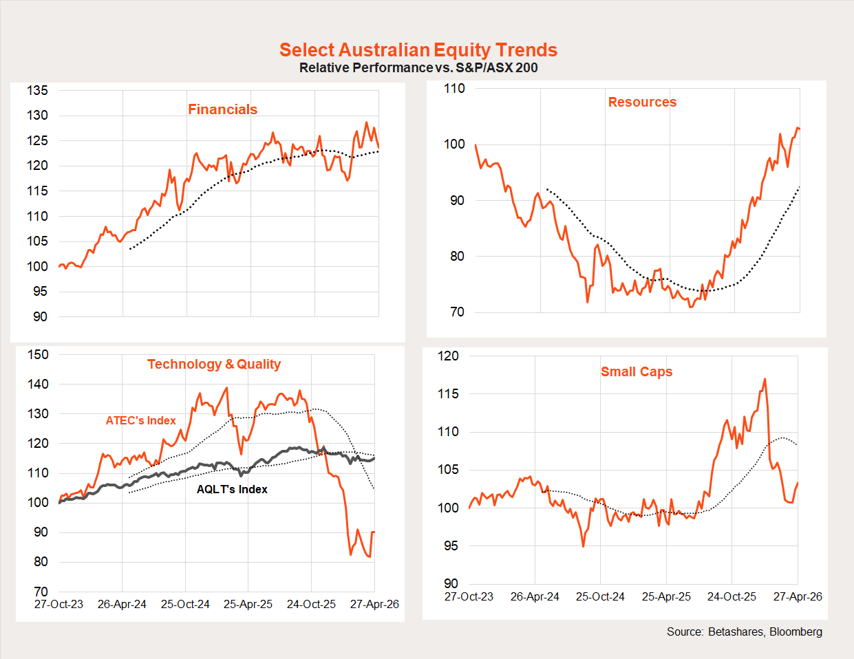 The Iran war had initially not been kind to high-beta local exposures such as technology and small caps. That said, the relative performance of both these areas has bottomed out in recent weeks, while resource company relative performance has resumed at the expense of financials.